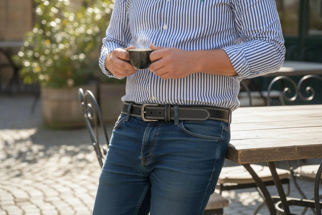 La couleur joue également un rôle important. Pour un look harmonieux, choisissez un modèle qui contraste légèrement avec votre jean. Une option marron foncé peut compléter un jean bleu marine, tandis qu'une ceinture noire s'associera bien avec un jean noir.